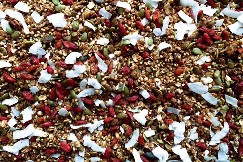 - Remove the granola from the oven, add the goji berries to the baking tray, gently toss and then leave the granola to cool completely before transferring it to a glass jar to be stored in a cool, dry place for up to 2 weeks