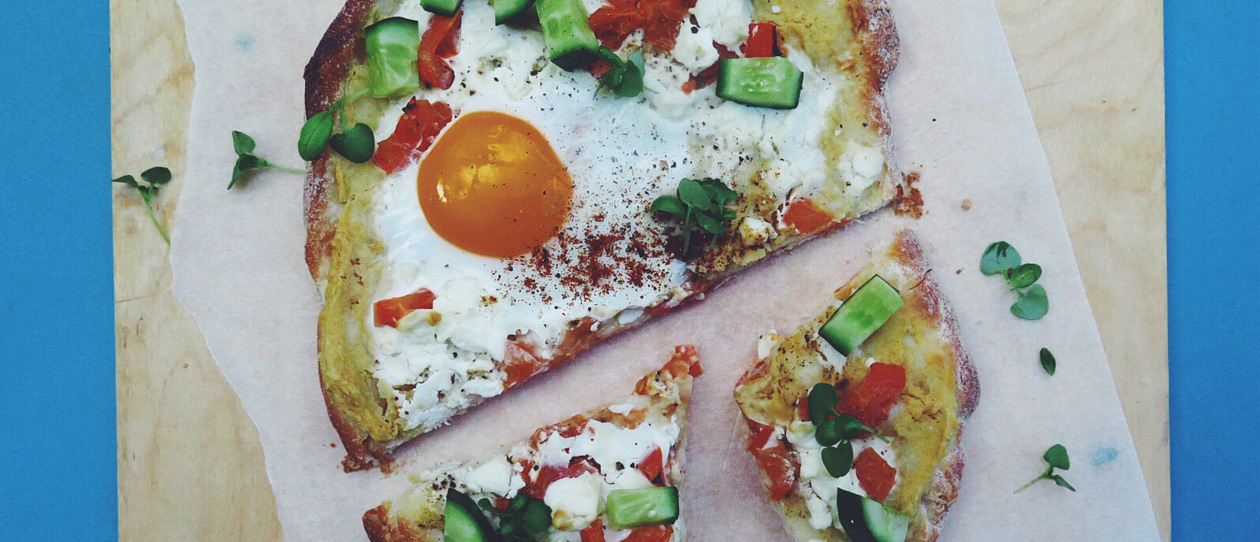 • Prepare your pizza by spreading the hummus onto the flatbread, sprinkle with salt and pepper, scatter the diced tomato and crumble the feta on top. Once all your toppings are spread out, crack the egg into the centre and place the pizza into the oven. Cook for 10-15 minutes or until the bread is golden and the egg is cooked to your liking
