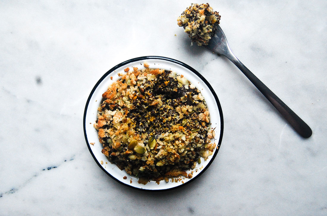- Combine the parmesan, breadcrumbs, the other tablespoon of thyme or rosemary, crushed pumpkin seeds and one tablespoon of olive oil (if all your topping ingredients are whole, pulse them in your blender or food processor to easily create your crumb)