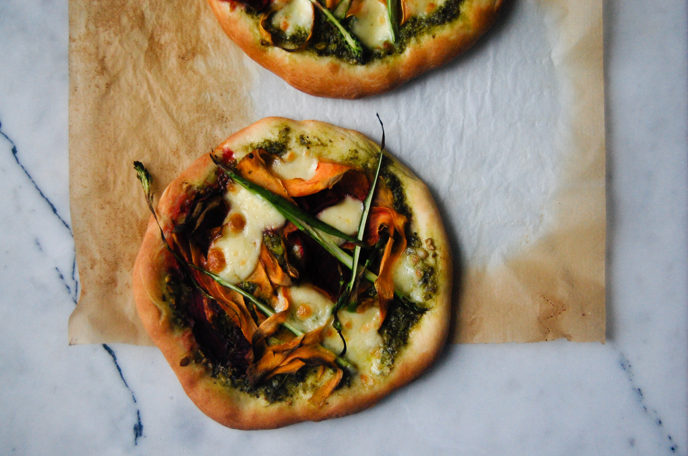 - Make your ribbons by running a peeler down the length of the vegetables to create long strips that can be curled on top of the pizzas. You will need to go around the beetroot to get long, curling strips.